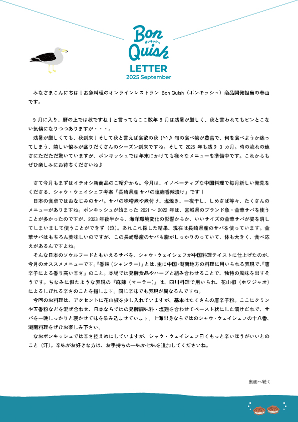 みなさまこんにちは!お魚料理のオンラインレストランBon Quish(ボンキッシュ)商品開発担当の春山です。