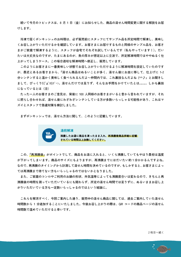続いて今月のトピックスは、8月1日(金)にお知らせした、商品の湯せん時間変更に関する解説をお届けします。