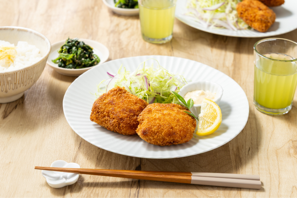 静岡県産の肉厚で上質な味わいのびんちょうまぐろを贅沢に使い、表面は香ばしく、中はしっとりジューシーなカツレツに仕上げました。爽やかな青紫蘇の香りが素材の旨味を引き立てます。タルタルソースをたっぷりつけて、熱々をお楽しみください。お持ちのウスターソースもよく合います。ビールはもちろん、白いご飯との相性も抜群です。