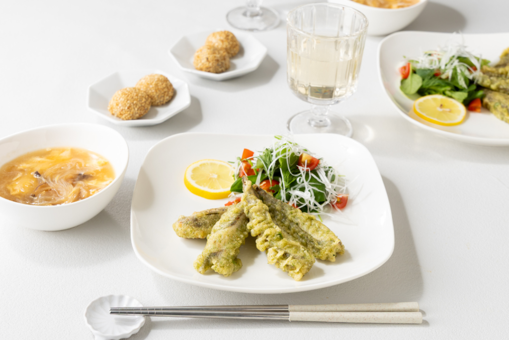 脂がのったやわらかな白身が特徴の福島県産メヒカリを、香港の家庭料理をルーツにしたフリットに仕立てました。衣にはコーンスターチやカスタードパウダーに加え油を練り込んでおり、香ばしく軽やかな食感が楽しめます。爽やかな青海苔の風味がアクセントとなり、魚の旨味と相まってあとを引く味わいに。中国料理の名手・シャウ・ウェイシェフならではの一皿は、爽やかな白ワイン「ミュスカデ」とのペアリングがおすすめです。ご家庭で、本格中国料理の趣をご堪能ください。