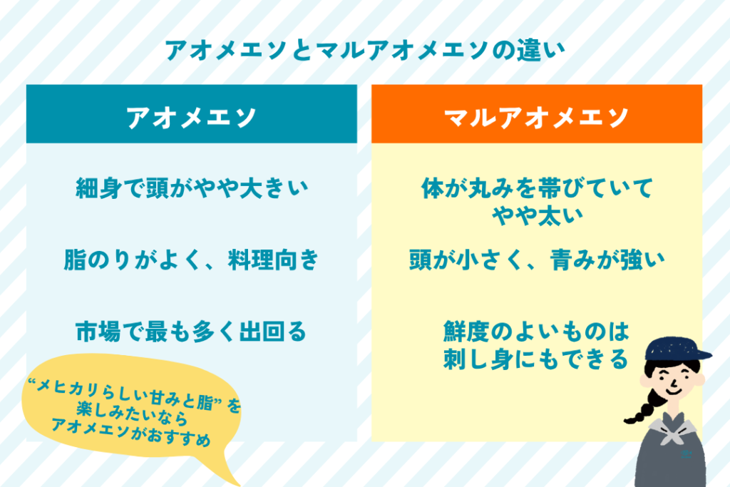 どちらも美味しいですが、“メヒカリらしい甘みと脂” を楽しみたいならアオメエソがベストです。