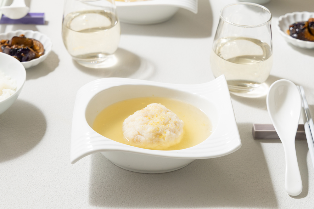 さくら色で透明感のある三陸のブランド魚「さくら真鱈」を、口どけのよい蒸し団子に仕立てました。この料理はシャウ・ウェイシェフが出場した中華料理の世界大会で、金賞を受賞した記念すべき逸品。丸い団子は日本の「日の丸」をイメージして作られたとのこと。鶏むね肉のだしに昆布と柚子の香りを合わせた、やさしく上品な日中融合の味わいが特徴です。フレッシュで爽やかな風味が特徴の北海道産白ワイン「ケルナー」とのマリアージュがおすすめ。また残ったスープにご飯を加えていただくのも格別です。ぜひお試しを。