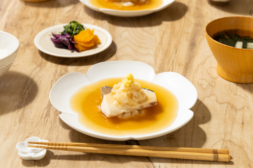 脂がのった大分県産津久見ぶりを、京都の冬の風物詩「かぶら蒸し」に仕立てました。かぶら蒸しは、すりおろしたかぶらの白さを雪に見立てた、風流な日本料理で、懐石の席などでも親しまれています。近藤シェフ特製のべっこう餡が全体をやわらかく包み込み、口の中でぶりとかぶらの繊細な旨味が広がります。寒さ厳しい冬の京都で愛される、体の芯まで温まる味わいを、ぜひご自宅でお楽しみください。