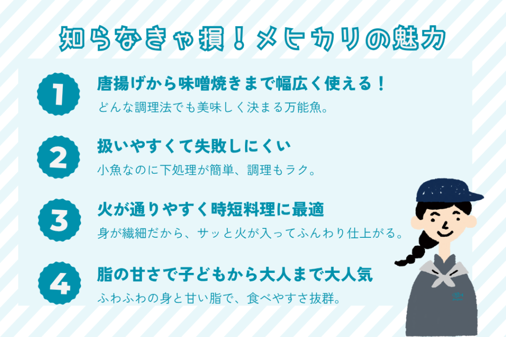 メヒカリは、わたしたちが思う以上に扱いやすく、どんな料理でもしっとり柔らかく仕上がる万能な魚。火の通りが早く時短にもなり、手軽さと美味しさを兼ね備えています。