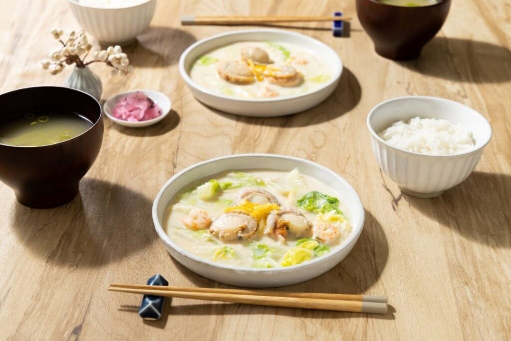 甘みの強さと上品な旨みが特徴の北海道産ホタテを、出汁に豆乳や西京味噌などを合わせた近藤シェフ特製スープでやさしく煮込みました。さらに熊本県産芝海老を加えることで、スープに奥行きが生まれ、滋味深い味わいに。白菜と白葱のやさしい甘みと、柚子の香りが全体を上品に包み込みます。心と体をやさしく温める一品を、ご家庭でお楽しみください。
