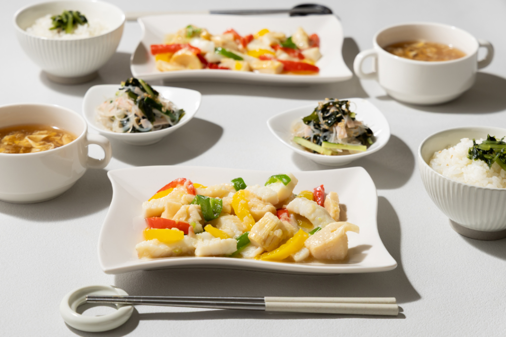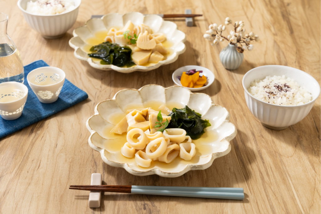 身がやわらかくあっさりとした味わいの青森県産アカイカと、筍を使った塩味仕立ての中華炒めをお届け。もち米に麹を加えた中華料理の発酵調味料『酒醸(チューニャン)』が、深みのある香りとコクを演出しています。アカイカの弾力のある食感と、歯切れのよい筍の食感のコントラストも魅力。