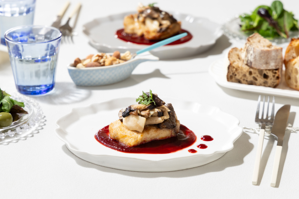 良質な脂をたたえた大分県産津久見ぶりを、表面は香ばしく、身はふっくらと仕上がるよう丁寧にポアレしました。合わせるのは、数種のキノコをソテーし、バターと生クリームでコク深くまとめたクリームソース。さらに、ビーツとバルサミコ酢をピューレにした甘酸っぱいビーツソースを添え、藤井シェフならではのバランス感覚が光る、彩りと味わい豊かな一皿に仕立てています。
