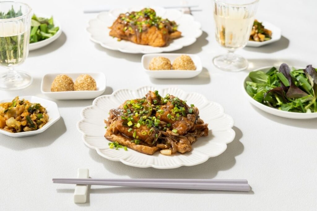 中国東北地方で長く親しまれるサワラを、甜麺醤やオイスターソース、葱を重ね香り高く仕上げました。焼いて旨味を閉じ込めたサワラと香ばしい豆腐に特製ソースがしみ込み、箸が止まらない美味しさです。