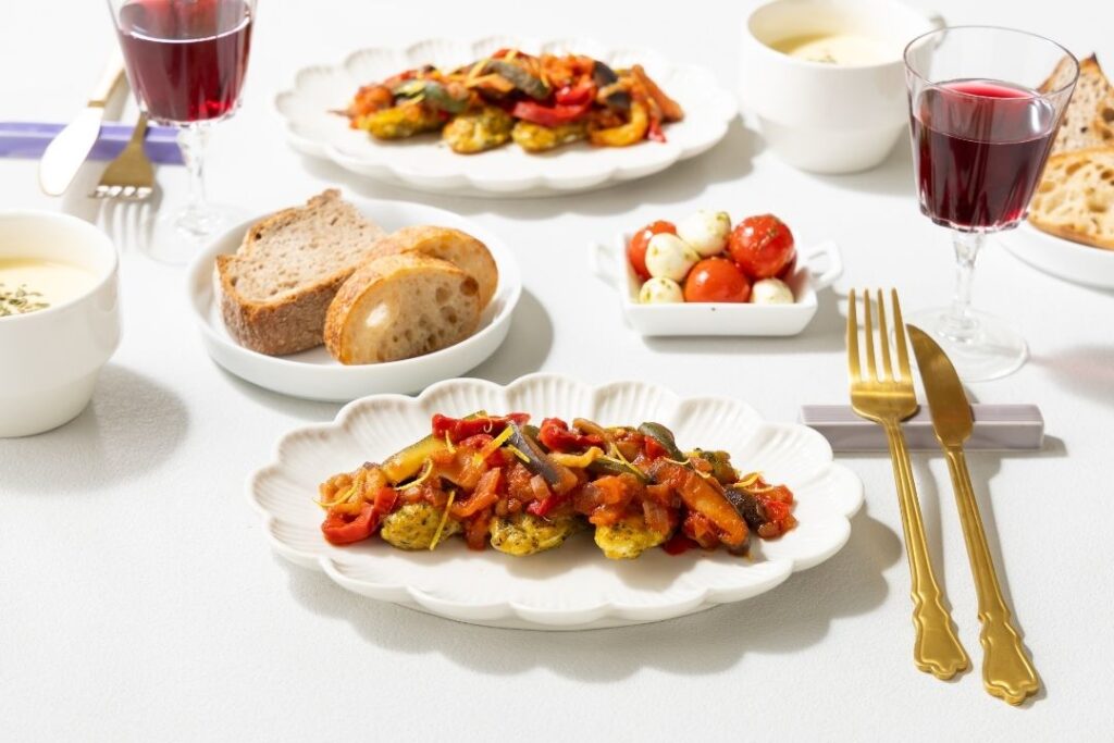 合わせるのは、パプリカやズッキーニ、なす、玉ねぎをたっぷり使ったトマトソース。
