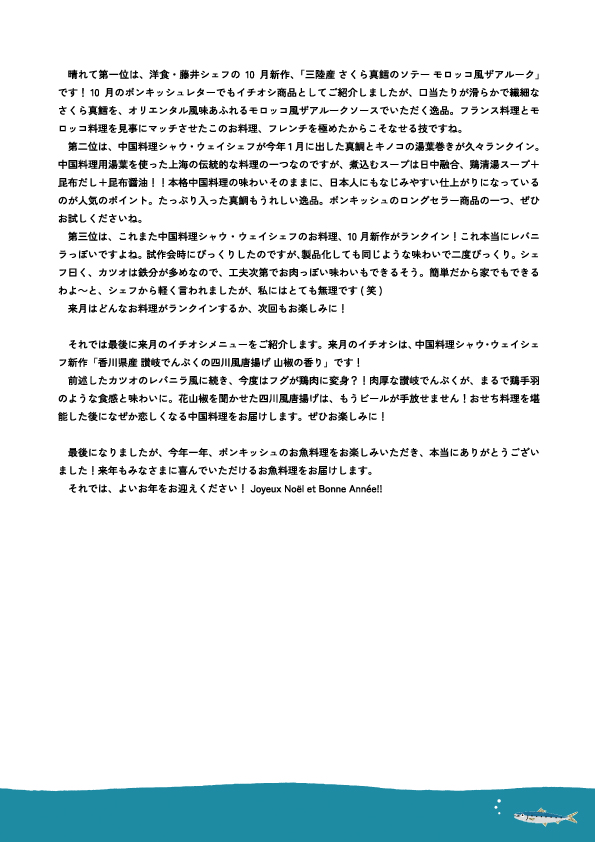最後になりましたが、今年一年、ボンキッシュのお魚料理をお楽しみいただき、本当にありがとうございました!来年もみなさまに喜んでいただけるお魚料理をお届けします。